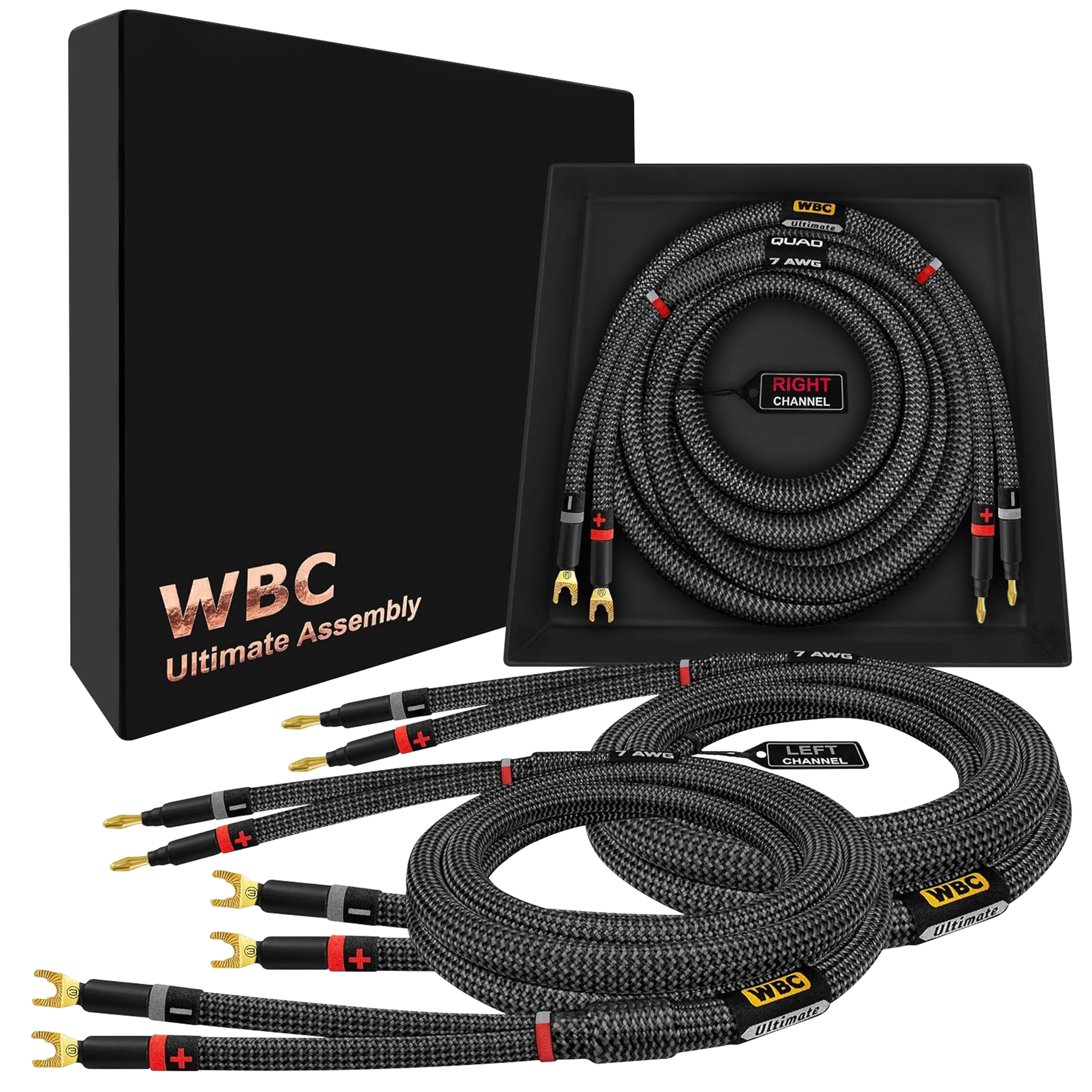 These WBC cables uses WBC Ultimate 7AWG wire with Eminence Gold spring banana and spade connectors.